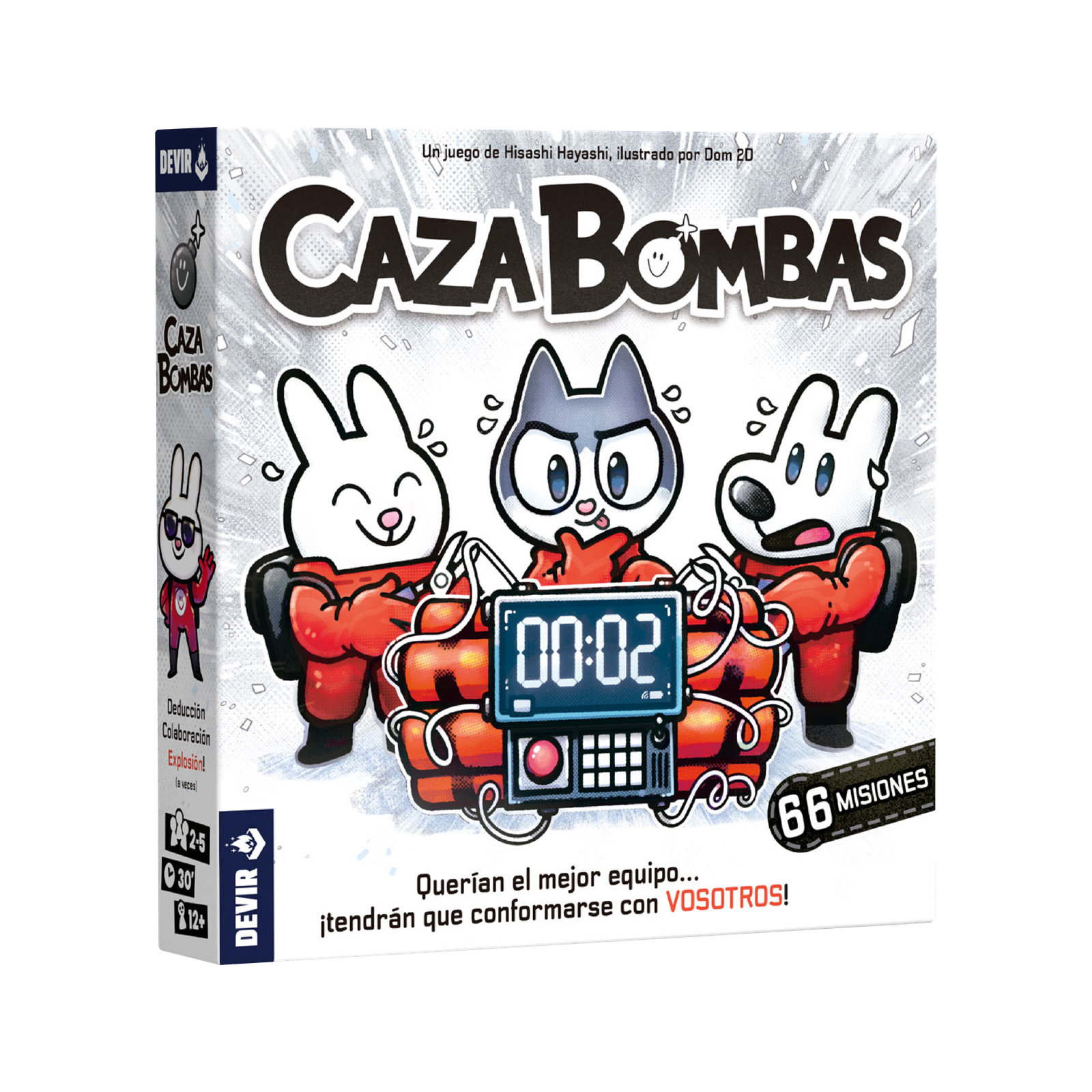 Diseñado por Hisashi Hayashi, Caza Bombas se puede disfrutar en pareja o en grupos de hasta 5 personas, a partir de 12 años, en misiones de unos 30 minutos. Caza Bombas es un juego cooperativo en el que cada jugador lleva a un artificiero. Todos los jugadores deberán trabajar en equipo con el objetivo de desactivar juntos la bomba de la misión asignada. ¡Pero cuidado! Si cortan un cable rojo o si el detonador llega al final, ¡la bomba explotará!