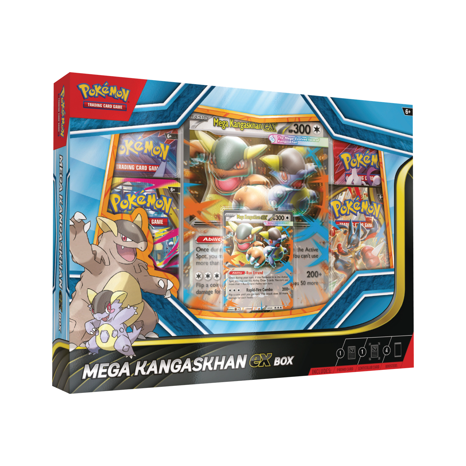 Tras la Megaevolución, la cría de Kangaskhan se convirtió en una fuerza imparable, ¡y ambos combinarán sus poderes como Mega-Kangaskhan ex para robar cartas extra con Encargo Urgente e intentar infligir aún más daño lanzando monedas con Combo Incesante! Une fuerzas con Mega-Kangaskhan ex que llega en forma de carta promo holográfica lista para jugar y en versión lenticular jumbo para presumir. ¡Además encontrarás otras increíbles cartas en los 4 sobres de refuerzo incluidos!