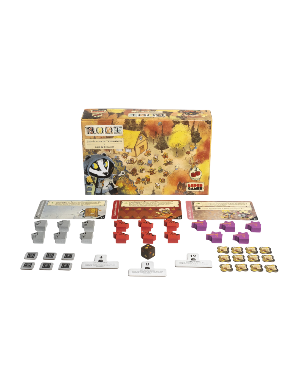 Contenido: 17 Figuras de Madera, 3 Cartas de Tarot, 6 Cámaras Acorazadas, 1 Dado, 12 Marcadores de Control, 3 Marcadores de Secuaces, caja de Secuaces, espacio para guardar todos tus secuaces de Root, incluyendo los de los siguientes productos: Expansión Los Merodeadores Pack de Secuaces Ribereños Pack de Secuaces Subterráneos.